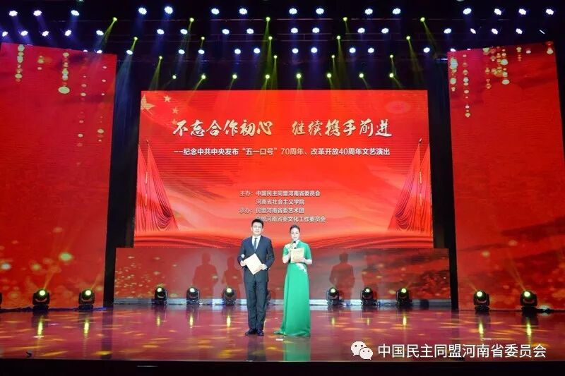 中國(guó)網(wǎng)4月22日訊 據(jù)民盟中央微信公眾號(hào)(中國(guó)民主同盟)消息,4月19日晚,由民盟河南省委、河南省社會(huì)主義學(xué)院主辦,民盟河南省委藝術(shù)團(tuán)、民盟河南省委文化工作委員會(huì)承辦的“不忘合作初心繼續(xù)攜手前進(jìn)——紀(jì)念五一口號(hào)發(fā)布70周年、改革開放40周年”文藝演出在河南省社會(huì)主義學(xué)院會(huì)議中心大禮堂舉行。