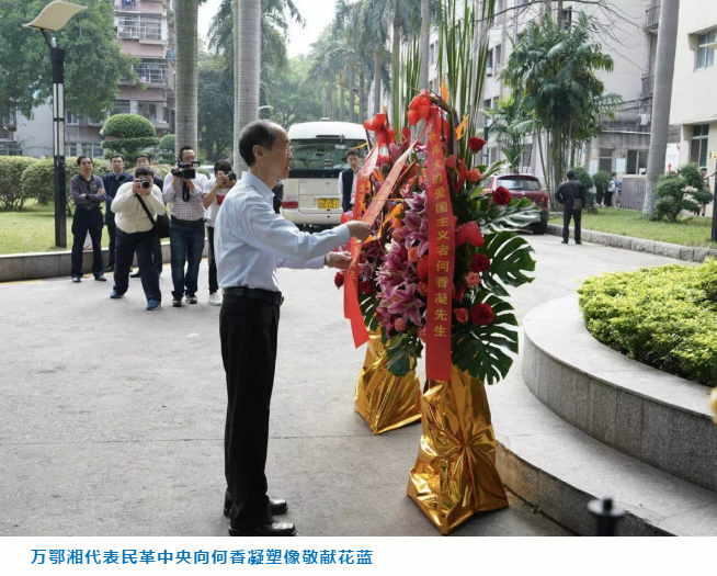 萬鄂湘參觀了校園內(nèi)的廖仲愷何香凝紀念館,并代表民革中央向何香凝漢白玉塑像敬獻花籃。