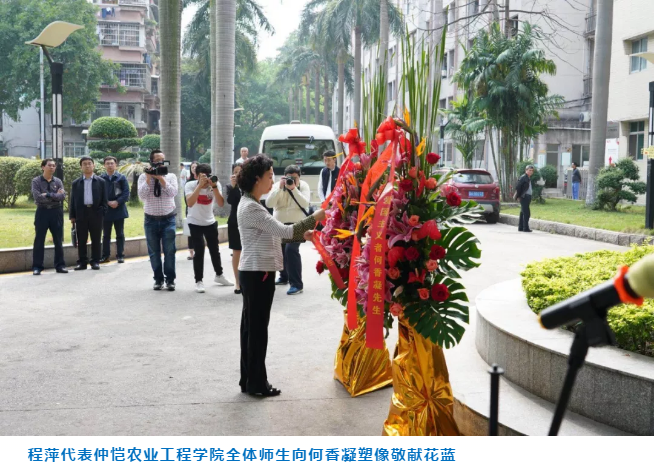 程萍代表仲愷農(nóng)業(yè)工程學院全體師生向何香凝漢白玉塑像敬獻花籃。