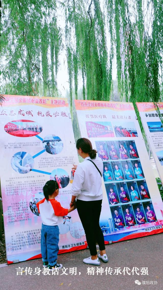 8月22日在濮水公園,某位市民正在帶領(lǐng)孩子觀看文明創(chuàng)建展板。